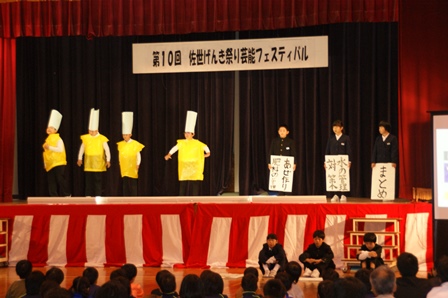 11月10日(日)佐世交流センター・佐世小学校を会場に「第10回佐世げんき祭り」を開催しました。小学校校庭ではふれあいゲートボール大会が開催され好天のもと熱戦が繰り広げられました。小学校体育館では、神楽、合唱、踊り、大東中学校吹奏楽部演奏などの芸能フェスティバルが行われ、フィナーレは景品付き抽選会で幕を閉じました。