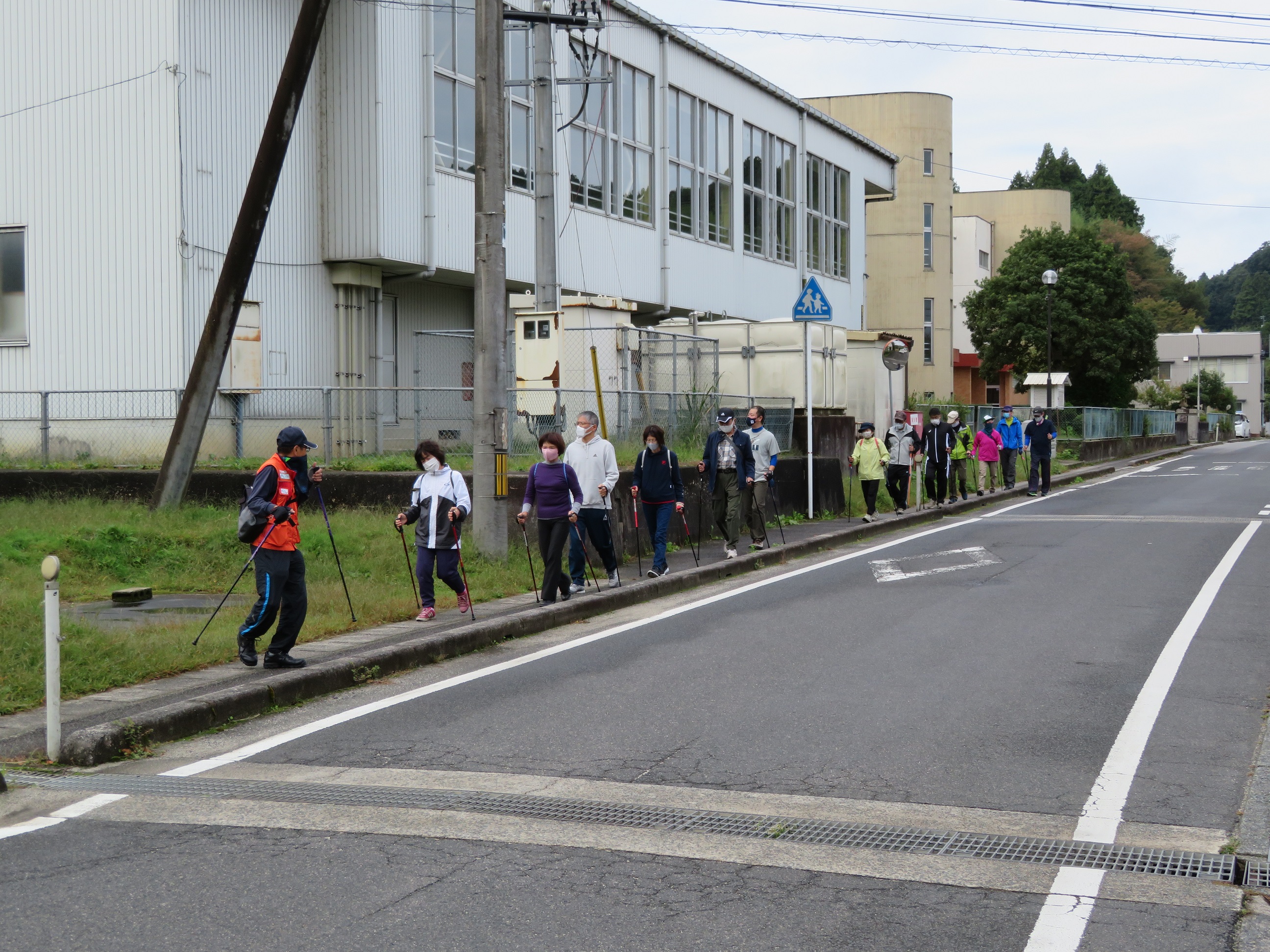 地域からは13名の皆さんの参加があり、ほとんどが初体験。最初は、右手右足が一緒に前へ出たり四苦八苦でしたが、徐々に慣れてくるとスムースに歩行できるようになり、狩山八幡宮までウォーキング。