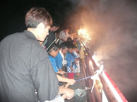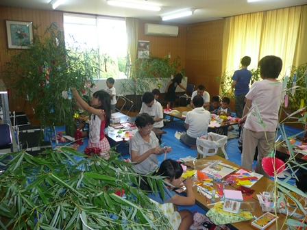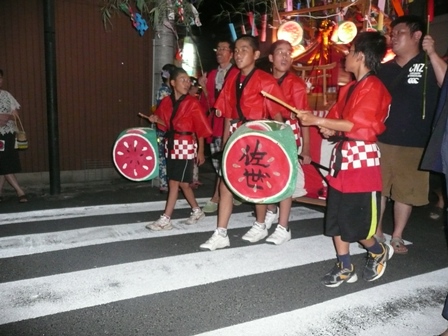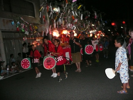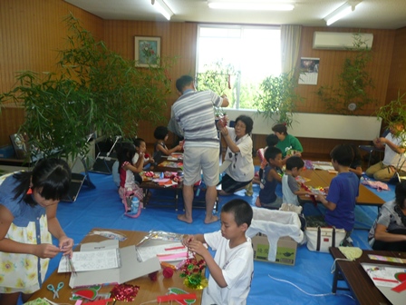 8月6日午前中、佐世交流センターで、させっこ広場に参加する児童や園児が保護者と一緒に笹飾りを作りました。そして、夕方からこれを持って大東七夕行列に参加しました。日野敏夫佐世七夕祭実行委員長を先頭に太鼓やおはやしに合わせ、提灯や笹飾りを手にして赤や青の法被姿で大東の街を練り歩 きました。最後に赤川土手で花火を上げて大はしゃぎでした。