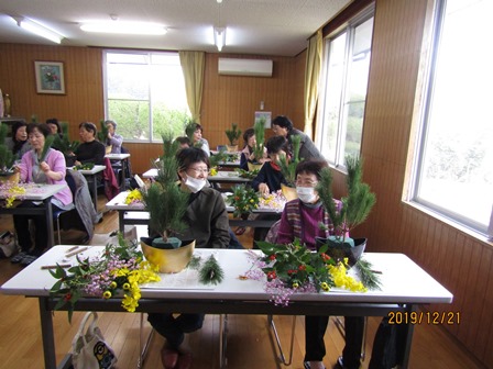 講師の指導により、松、菊、青もじ、千両、カスミソウ、オンシジュウムを使い、お正月用のアレンジ花を、「なるほど」「こーでいいだあか」「(花器の)おおめぐーに活けるだあ」などと言いながら、真剣に、賑やかに活けていただきました。