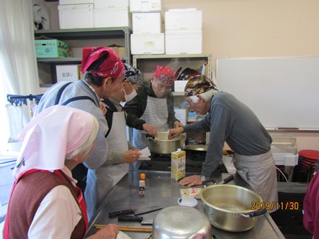 牛肉入りキムチごはん、白菜のぐつぐつ煮、カリフラワーの和風ポタージュの3品の料理でしたが、家ではほとんど料理をしない参加者もエプロン、三角巾を身に着けて包丁を握り、講師の指導のもと見事に作り上げることができました。