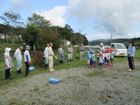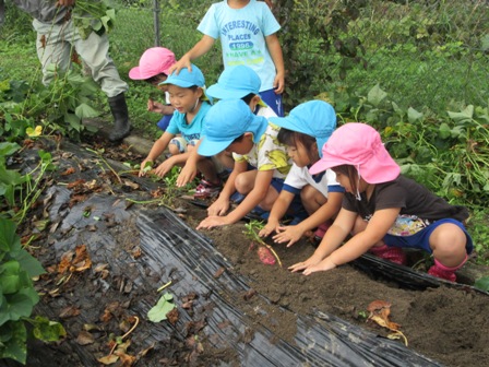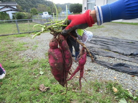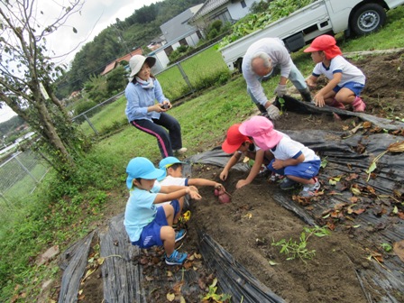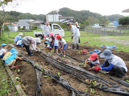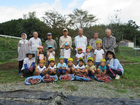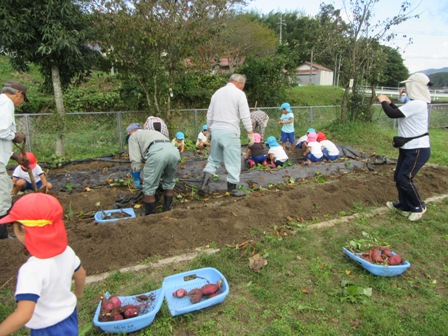 10月6日(木) 秋空の下、佐世地区連合寿朗会の会員、生涯学習部員が佐世幼稚園に集まり、13人の園児と一緒に芋掘りを行い、元気いっぱいの園児達によって次々とおいしそうな芋が掘り出されました。