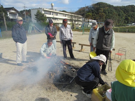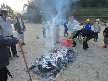 11月16日(水)の焼き芋交流は、スクモを使って焼き芋をしましたが、時間がかかり思うように焼けません。最後にはスクモの上から枯れ枝などを燃やしてやっとおいしい焼き芋のできあがり。
