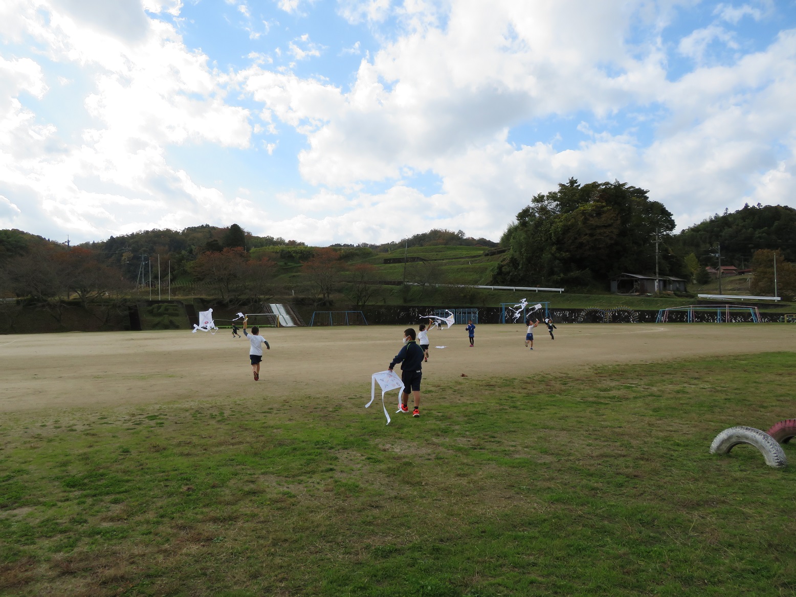 寿朗会の凧作り名人の皆さんに作り方の説明を聞きながら、さっそく子どもたちは自分で絵を描いてきた障子紙で凧作りに挑戦。竹ひごをつけたり凧足・凧糸をつけたり悪戦苦闘。今年はコロナ過でお茶を飲みながらの交流は止め、みんなでグランドへ出かけて早速凧あげをしました。天気も良く、子供たちも「うゎ~あがった、あがった~」と大喜び、広い校庭を駆け回っていました。