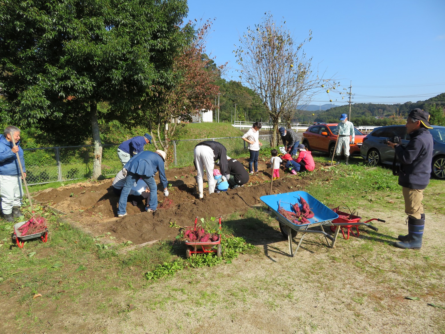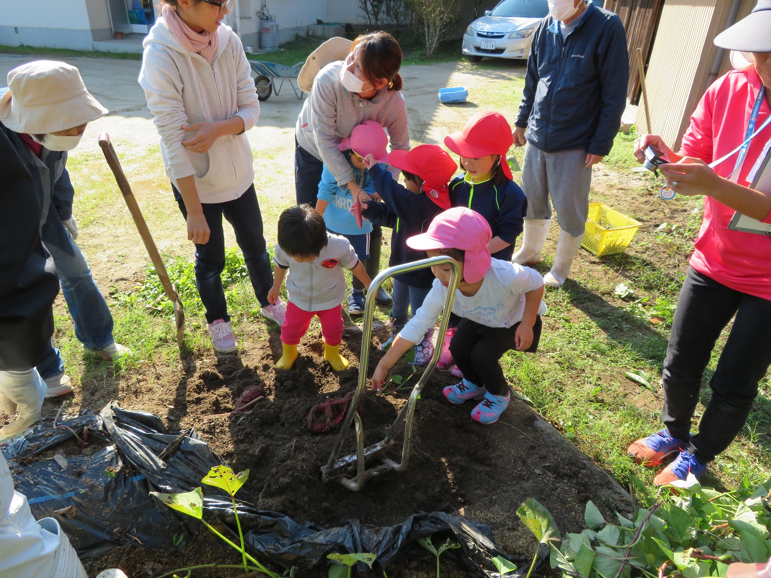 当日は秋晴れのいい天気で、園児たちは、「わ~すごい。重いな~」「早く食べた~い」などと大きな声をあげながら、芋掘りをしていました。