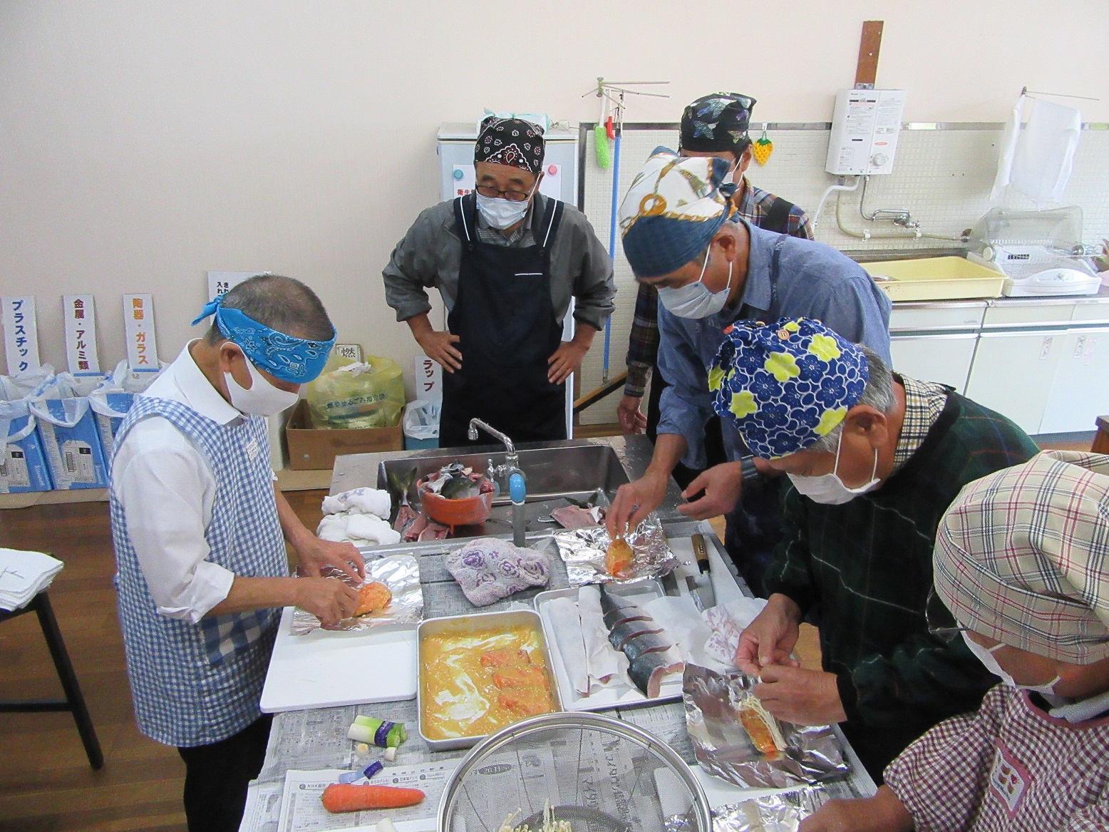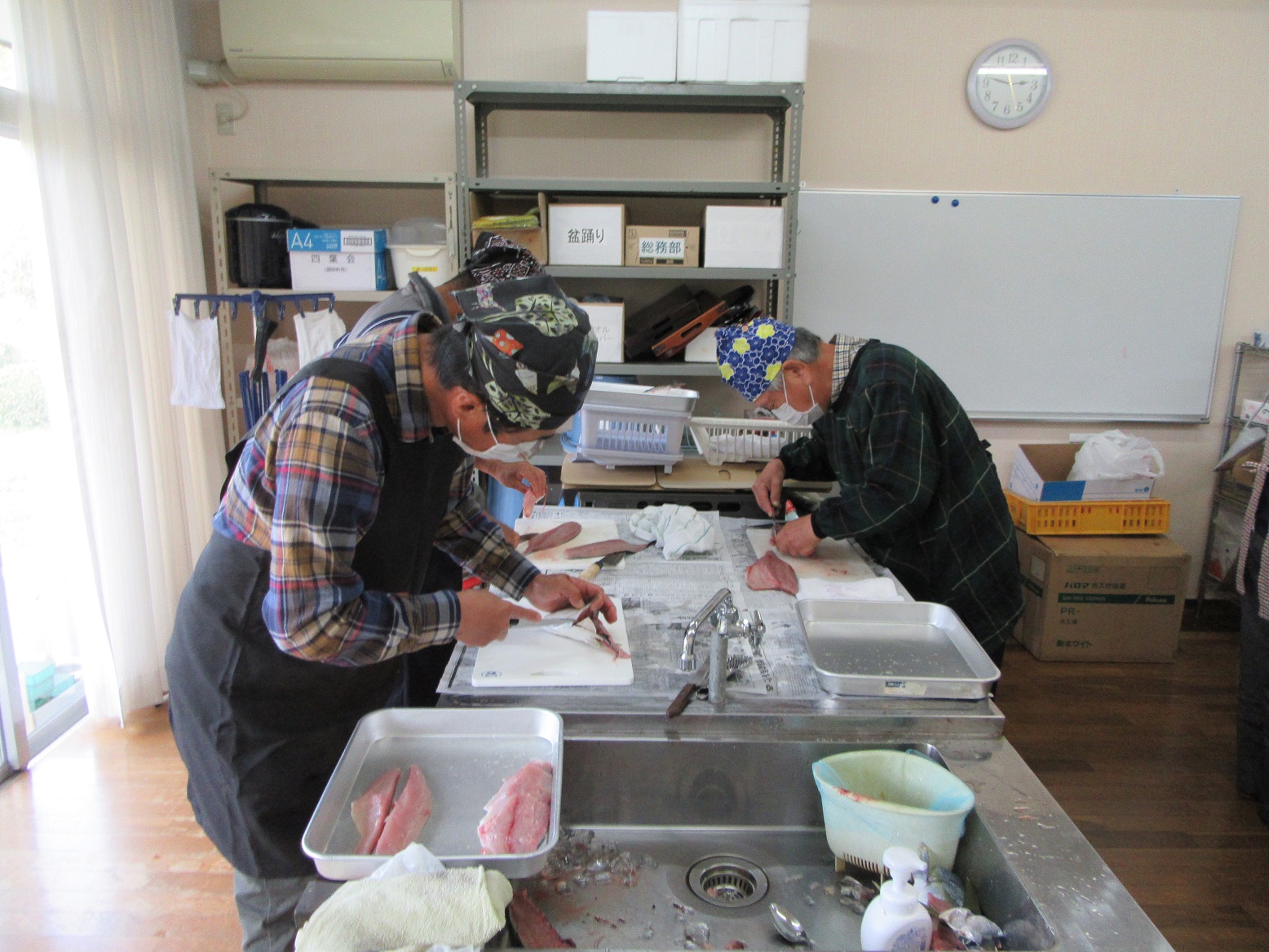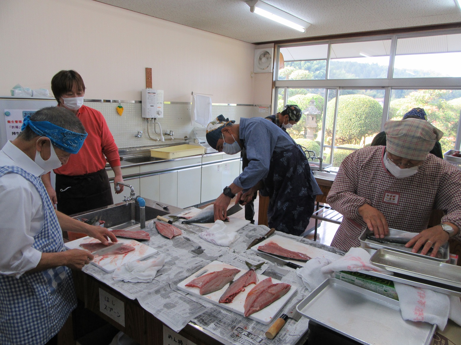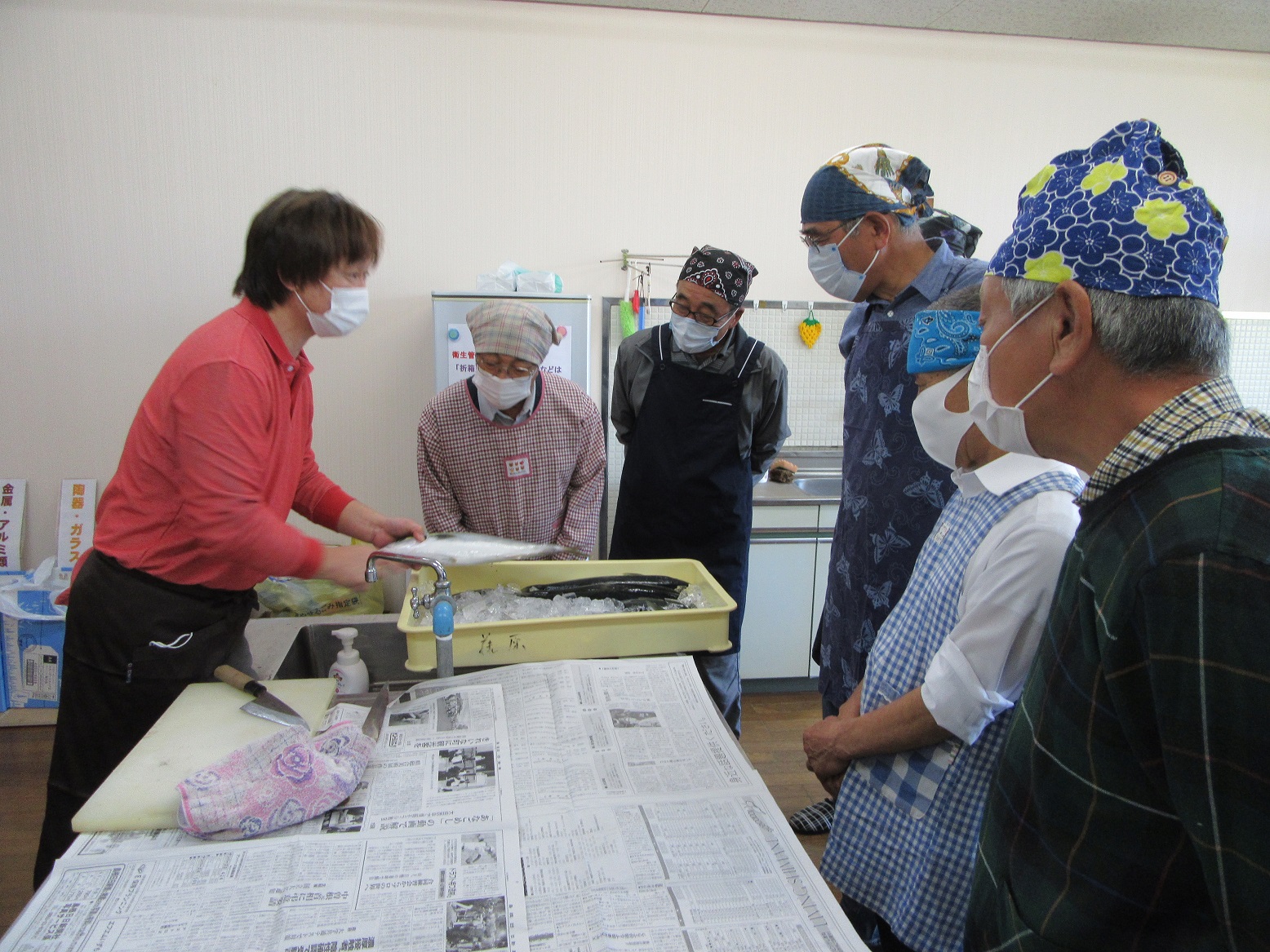 令和2年11月17日(火)大東町神田町の藤原鮮魚店藤原修二さんを講師に迎え、魚を使った「男の料理教室」を開催し、おおむね60代の男性7名の参加がありました。